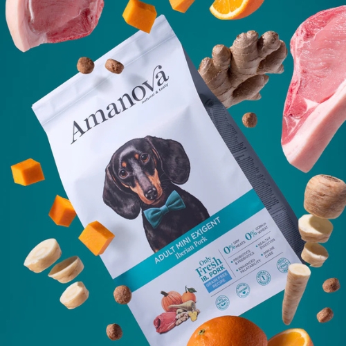 AM Adult Mini Exigent Iberian Pork is speciaal ontwikkeld voor volwassen honden van kleine rassen met een moeilijke eetlust. Deze hoogwaardige voeding is graanvrij en bereid met vers Iberisch varkensvlees als enige dierlijke eiwitbron. Hierdoor is de voeding zeer geschikt voor honden met voedselintoleranties of gevoeligheden.
