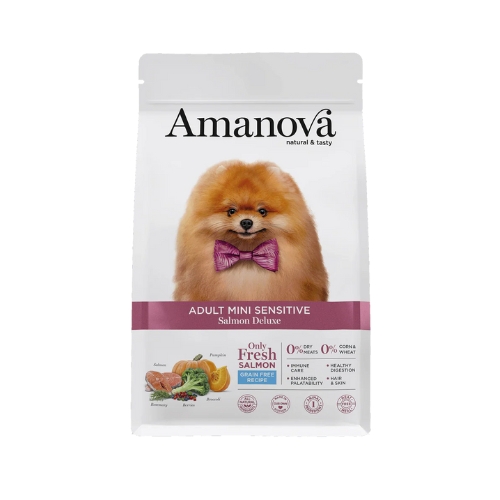 AM Adult Mini Sensitive Salmon Deluxe is speciaal ontwikkeld voor volwassen honden van kleine rassen met een gevoelige spijsvertering of extra behoefte aan huid en vachtverzorging. Deze hypoallergene voeding is bereid met vers bereide zalm als enige dierlijke eiwitbron en biedt een uitstekende verteerbaarheid en hoge voedingswaarde.