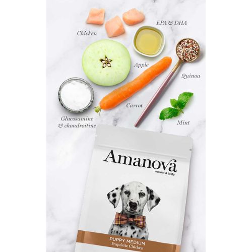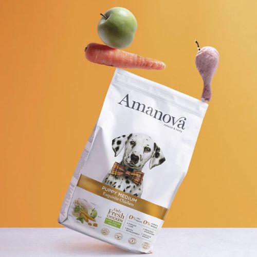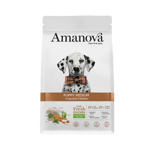 AM Puppy Medium Exquisite Chicken is een hypoallergene puppyvoeding met vers bereide kip, speciaal ontwikkeld voor puppy’s van middelgrote rassen. De aangepaste brokvorm ondersteunt een gezonde groei, sterke botten en een optimale ontwikkeling van spieren en gewrichten.