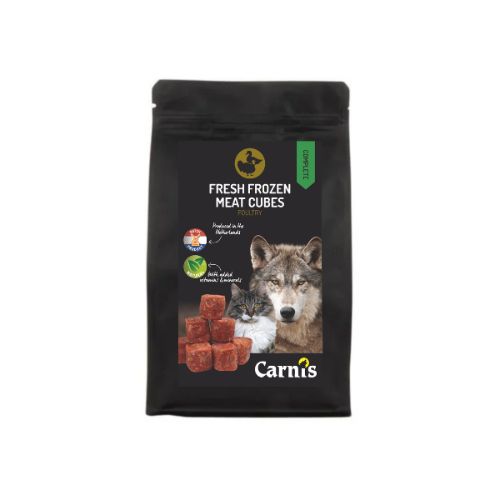 Carnis Cubes Gevogelte Compleet is een volledige diepvriesvoeding voor volwassen honden en katten. Deze maaltijd is samengesteld uit verschillende soorten gevogelte en voorziet in de dagelijkse voedingsbehoefte.