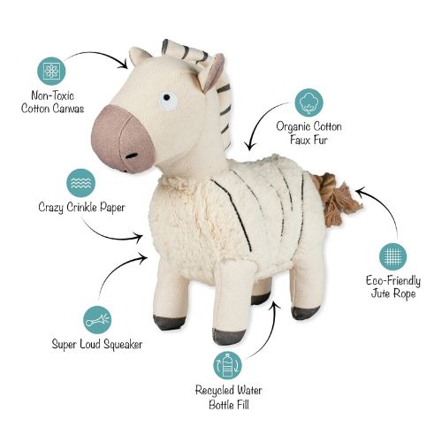 Het speelgoed is gemaakt van niet giftig canvas, biologisch katoenen imitatiebont, stevig jutetouw en gevuld met gerecyclede plastic flessen. Dankzij de extra luide pieper, het knisperpapier en het trektouw blijft jouw hond actief en nieuwsgierig tijdens ieder speelmoment.