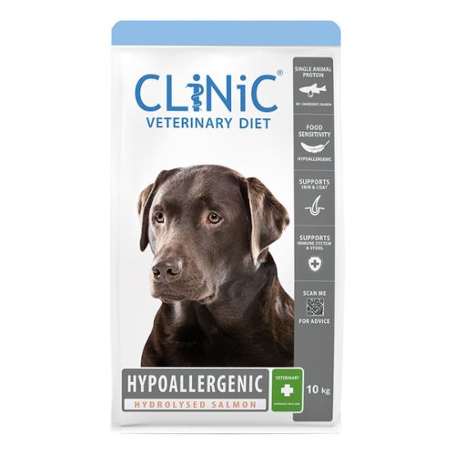 CLiNiC Hypoallergenic Zalm is een complete dieetvoeding voor honden met voedselallergieën, voedselintoleranties en huid of vachtproblemen. Deze zorgvuldig samengestelde hondenbrok bevat gehydrolyseerde zalm als enige dierlijke eiwitbron en is volledig tarweglutenvrij. Hierdoor wordt de kans op een ongewenste reactie op voeding aanzienlijk verkleind.