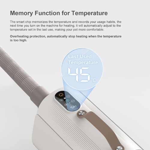 Het toestel wordt geleverd met vier slimme opzetstukken die elk hun eigen functie hebben. Het brede mondstuk is ideaal voor het snel drogen van grote oppervlakken zoals rug en flanken. Het smalle mondstuk geeft meer precisie en is perfect voor poten, oren en moeilijk bereikbare plekken. Het kam opzetstuk ontklit de vacht terwijl je droogt wat zorgt voor een gladdere en verzorgde afwerking. Voor honden met een gevoelige huid is de ronde diffuser ideaal dankzij de zachte en gelijkmatige luchtverdeling. De waterblazer is eenvoudig te bedienen met een modern touchpad waardoor je moeiteloos wisselt tussen standen.