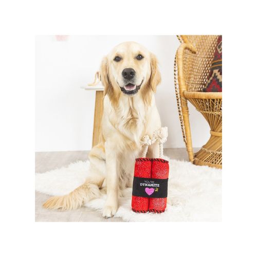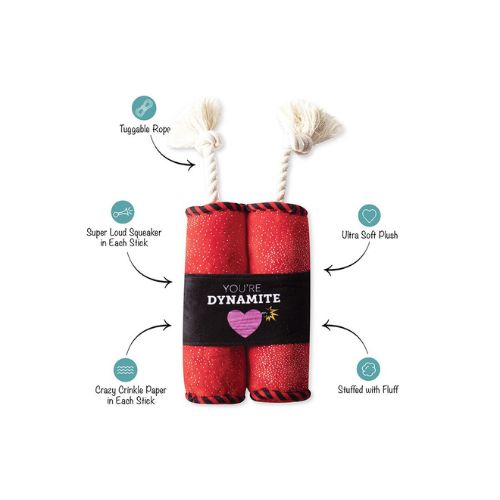 You’re Dynamite is een speels en opvallend hondenspeeltje dat zorgt voor extra veel interactief speelplezier. Dit dynamietvormige speeltje combineert een extra luide pieper, knisperpapier, zacht pluche en stevig touw, waardoor het perfect is voor honden die graag trekken, schudden, piepen en knuffelen.